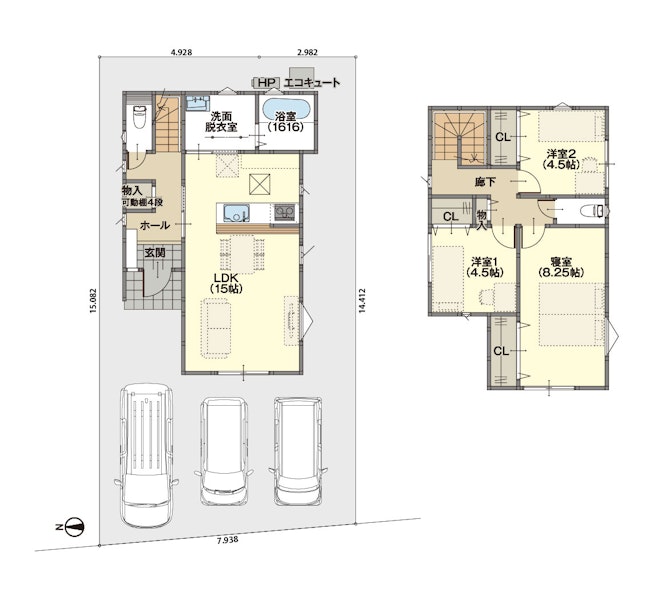 約15帖のLDKは、家族みんなで楽しい時間を過ごすのにぴったりな空間。全居室にクローゼット(CL)、各ホール内にも物入を備えており、自然と整頓上手になれる間取りです♪
