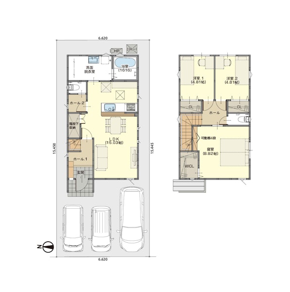 15.03帖のLDKを住まいの中心に配置し、家族が自然と顔を合わせやすい間取りに。対面キッチンを採用することで、家事中もコミュニケーションが取りやすい、暮らしやすさを考えた住まいです。