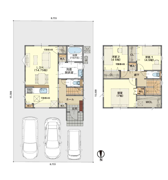 ◆家事ラク動線3LDK+キッチン・2階ホール・各居室に物入で収納力◎