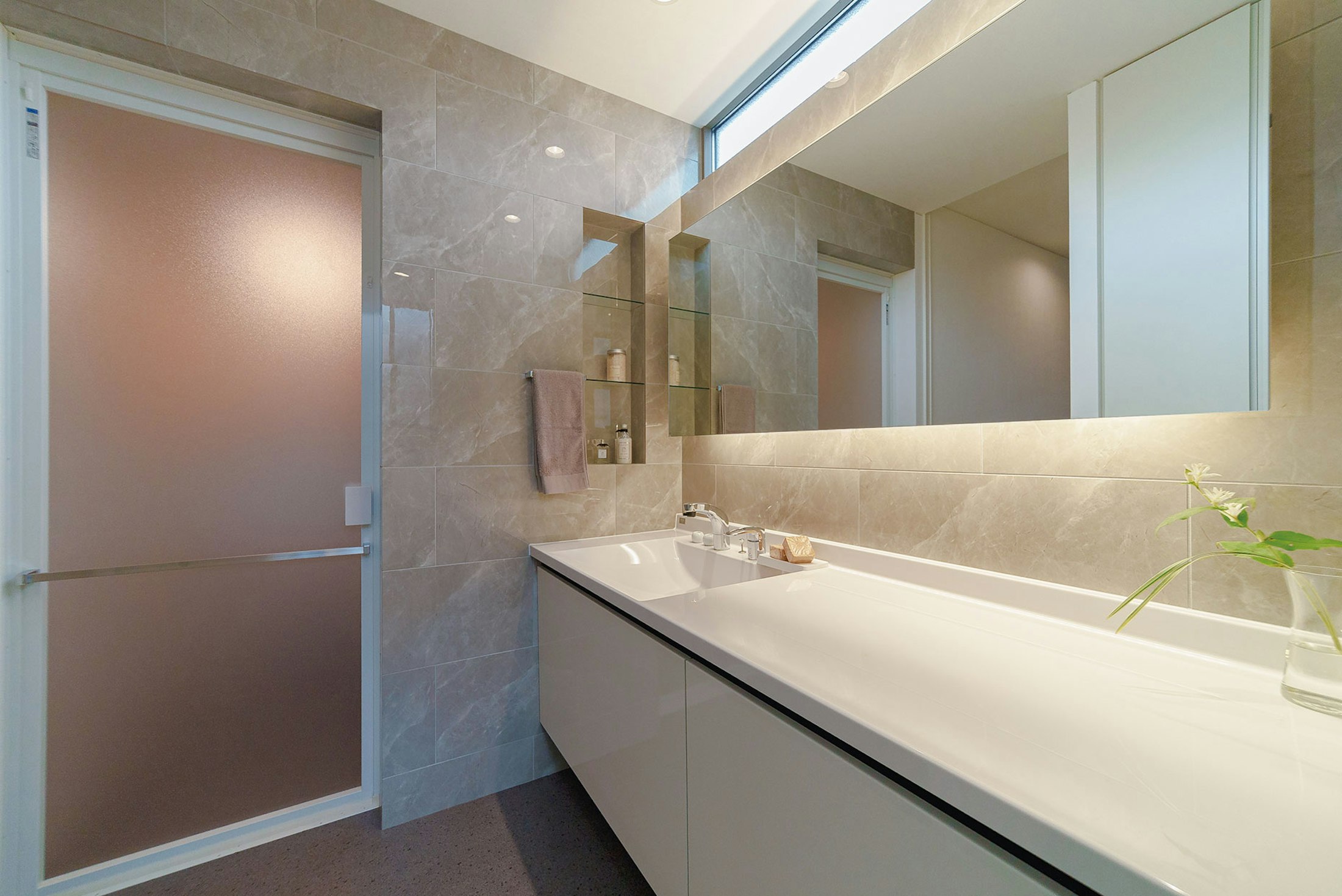 大判のタイルで仕上げた、高級ホテルのような洗面ルーム。2人で立てる広さを確保した。
