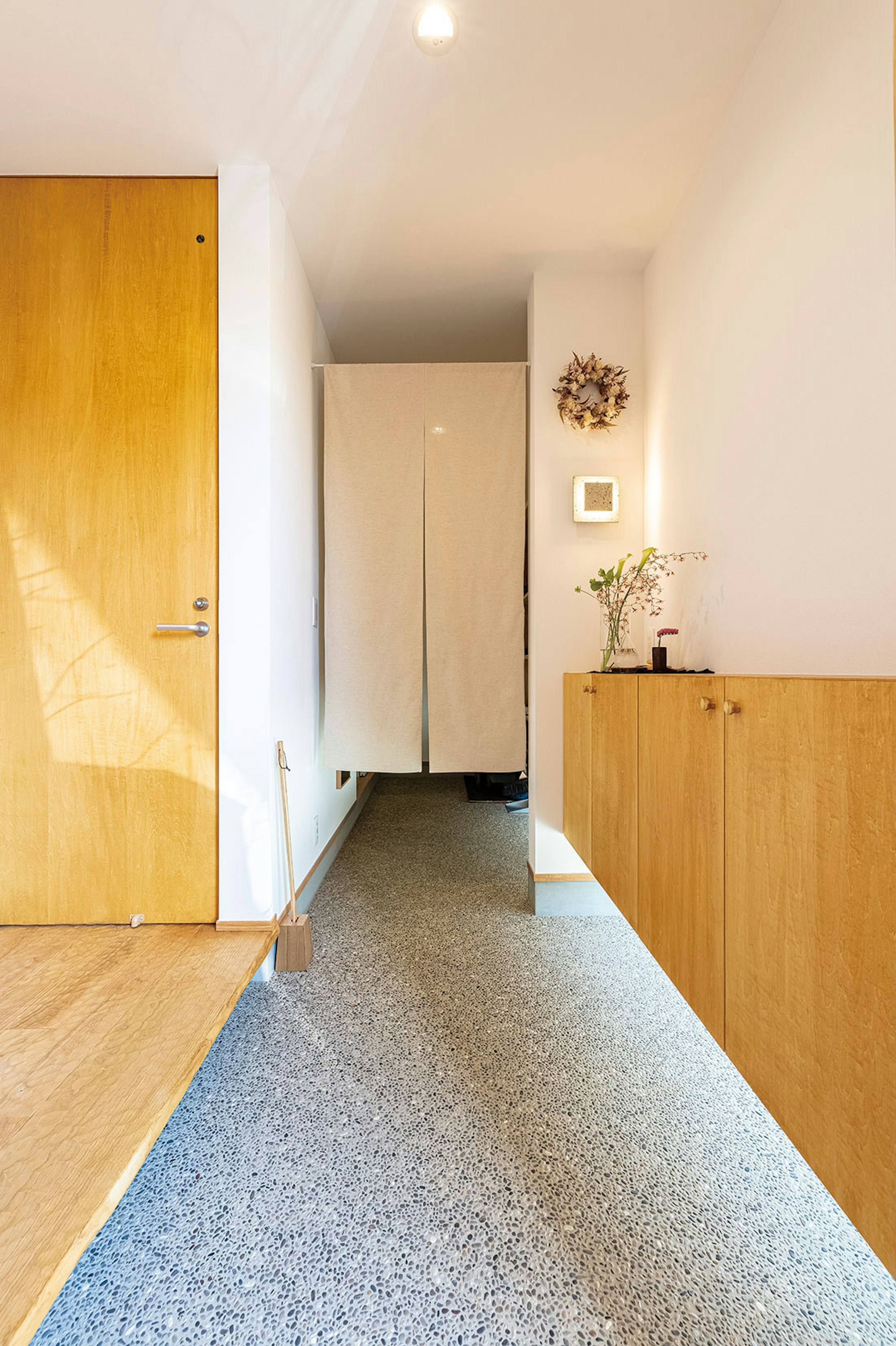豆砂利洗い出しにした玄関のたたきは、奥のシューズクロークまでつなげることで、広がりが生まれる。