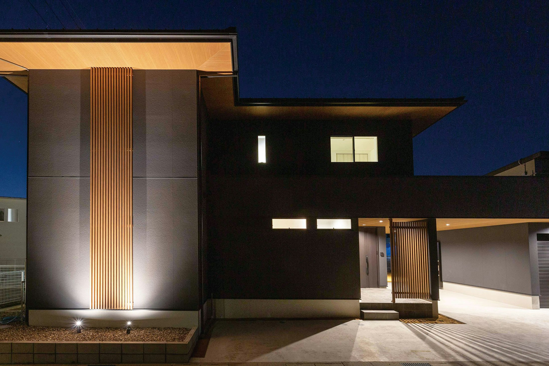インナーガレージを設けた、ダークブルーの外観。夜は間接照明で、昼間とは違う重厚感のある住まいを演出する。