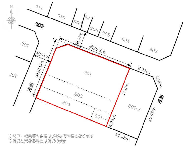| 私道負担・道路 | 角地 (西側 公道6.0m 間口20.8m) (北側 公道6.0m 間口25.5m) |