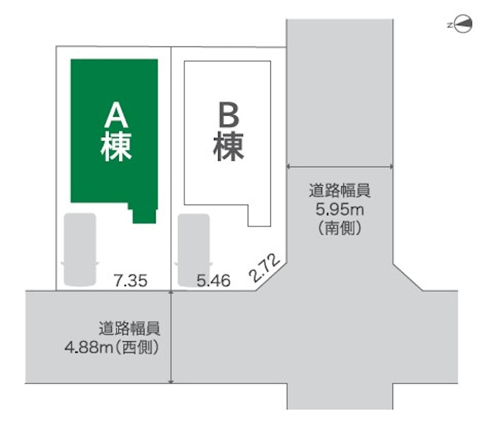 | 私道負担・道路 | 私道負担:なし 道路幅:4.88m(西側)5.95m(南側) |