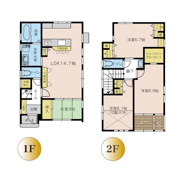 | 建物の特徴 | バリアフリー, 収納が多い, 家事ラク動線, ウオークインクローゼット, シューズインクローゼット, 外部収納, 浴室乾燥機, ルーフバルコニー, 和室あり, サンルームあり, 書斎・ワークスペース |