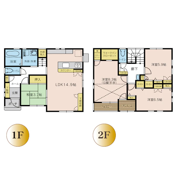 | 建物の特徴 | バリアフリー, 収納が多い, 家事ラク動線, ウオークインクローゼット, シューズインクローゼット, 外部収納, 浴室乾燥機, ルーフバルコニー, 和室あり, サンルームあり, 書斎・ワークスペース |