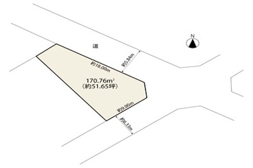 | 私道負担・道路 | 負担なし・幅員 : 北東側 約5.84m 公道、 間口 : 約 18.00m/幅員 : 南東側 約6.33m 公道、 間口 : 約 9.00m |