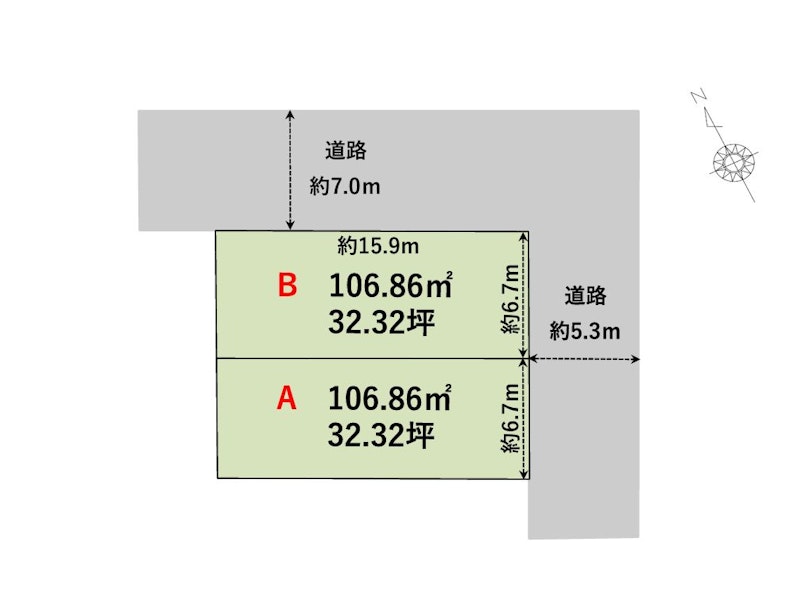 | 私道負担・道路 | 負担なし・道路幅員 A:東 約5.3m B:東 約5.3m、北 約7.0m |