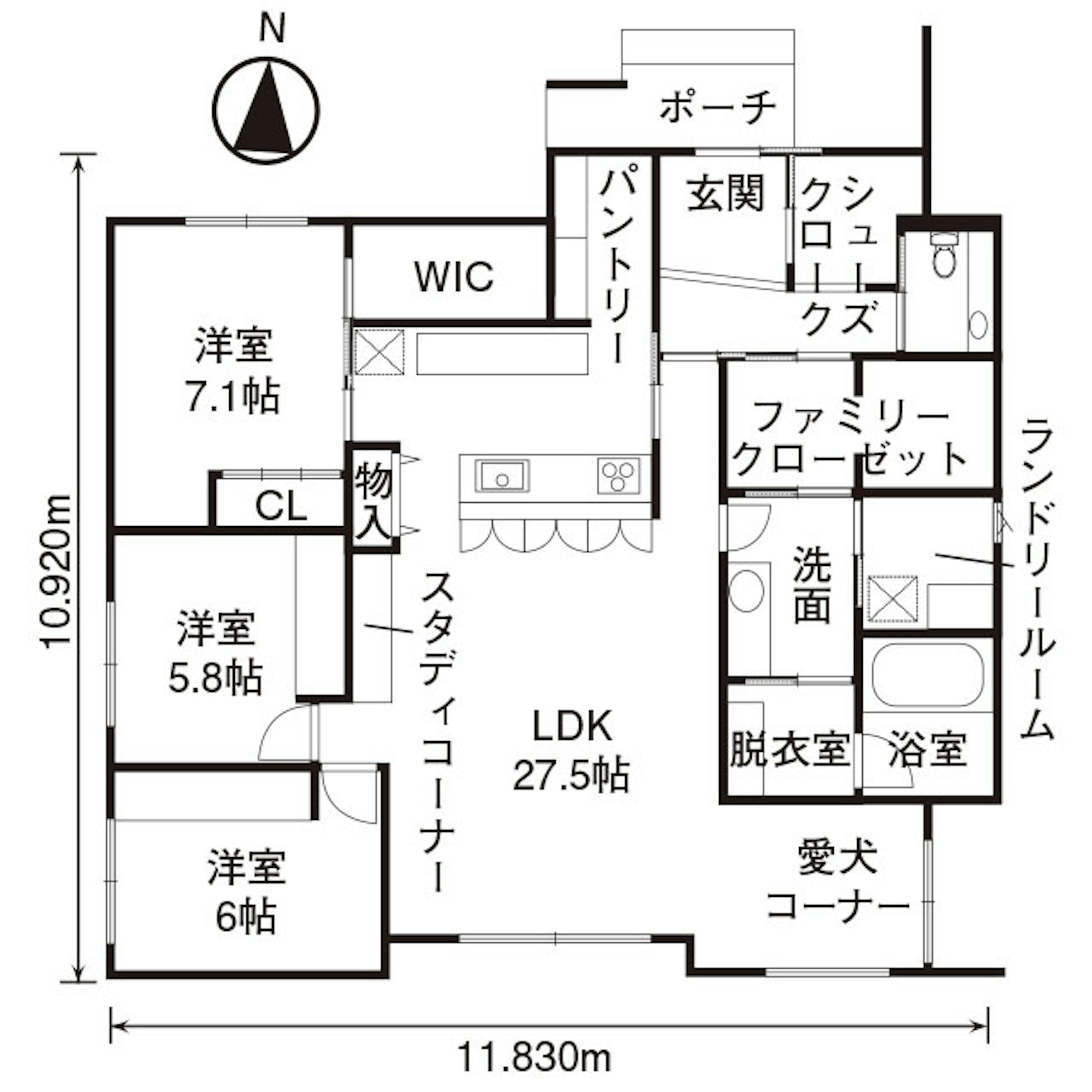 ファミリークローゼット→洗面→ランドリースペースを一直線に並べた水まわり動線。洗う、干す、収納が最短動線で完結する。