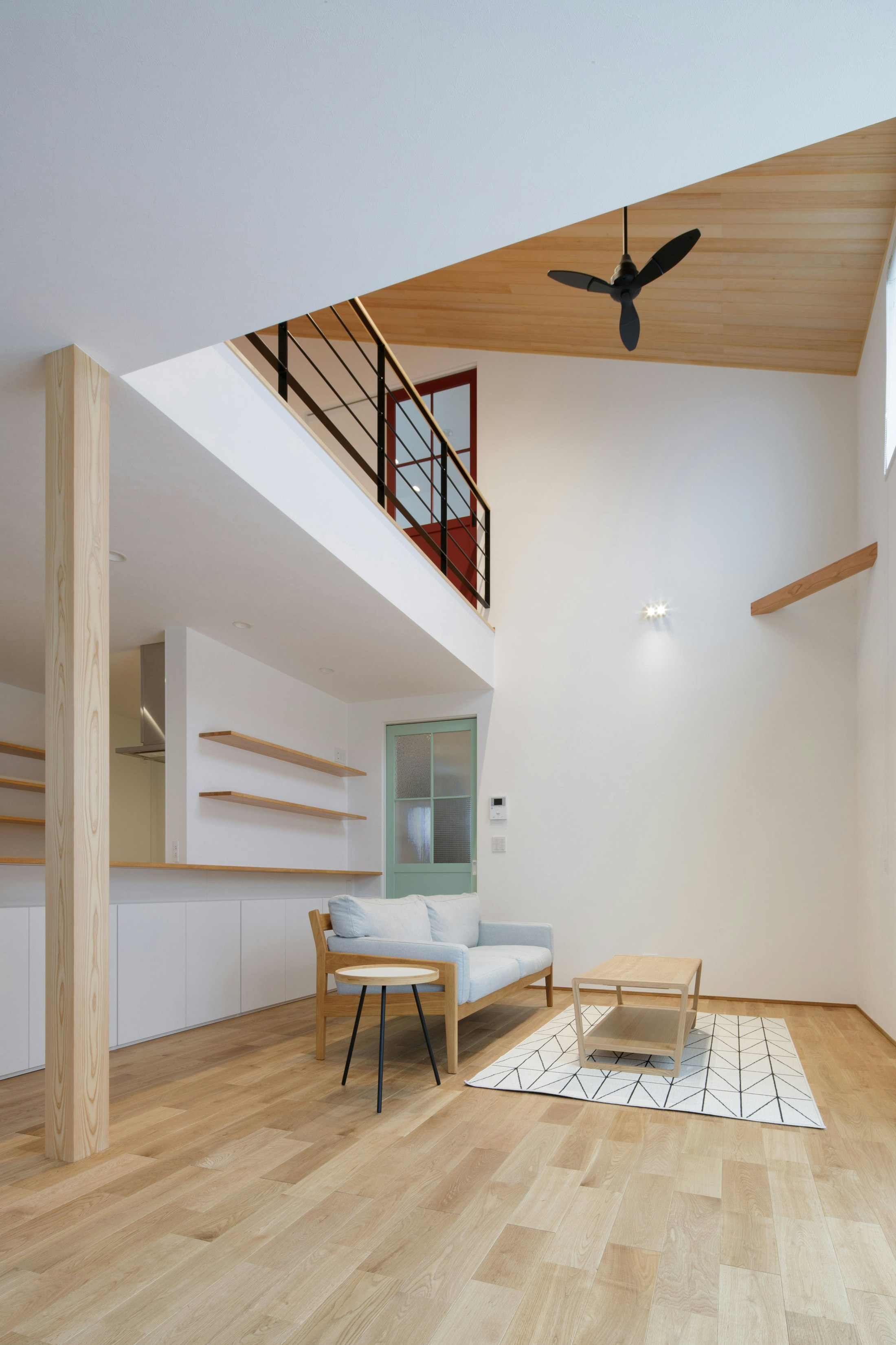 模様替えしやすいようにと、あえてLDKには作り付けの家具は設けていない。吹き抜けを通して、2階にいる家族の気配も感じられる。