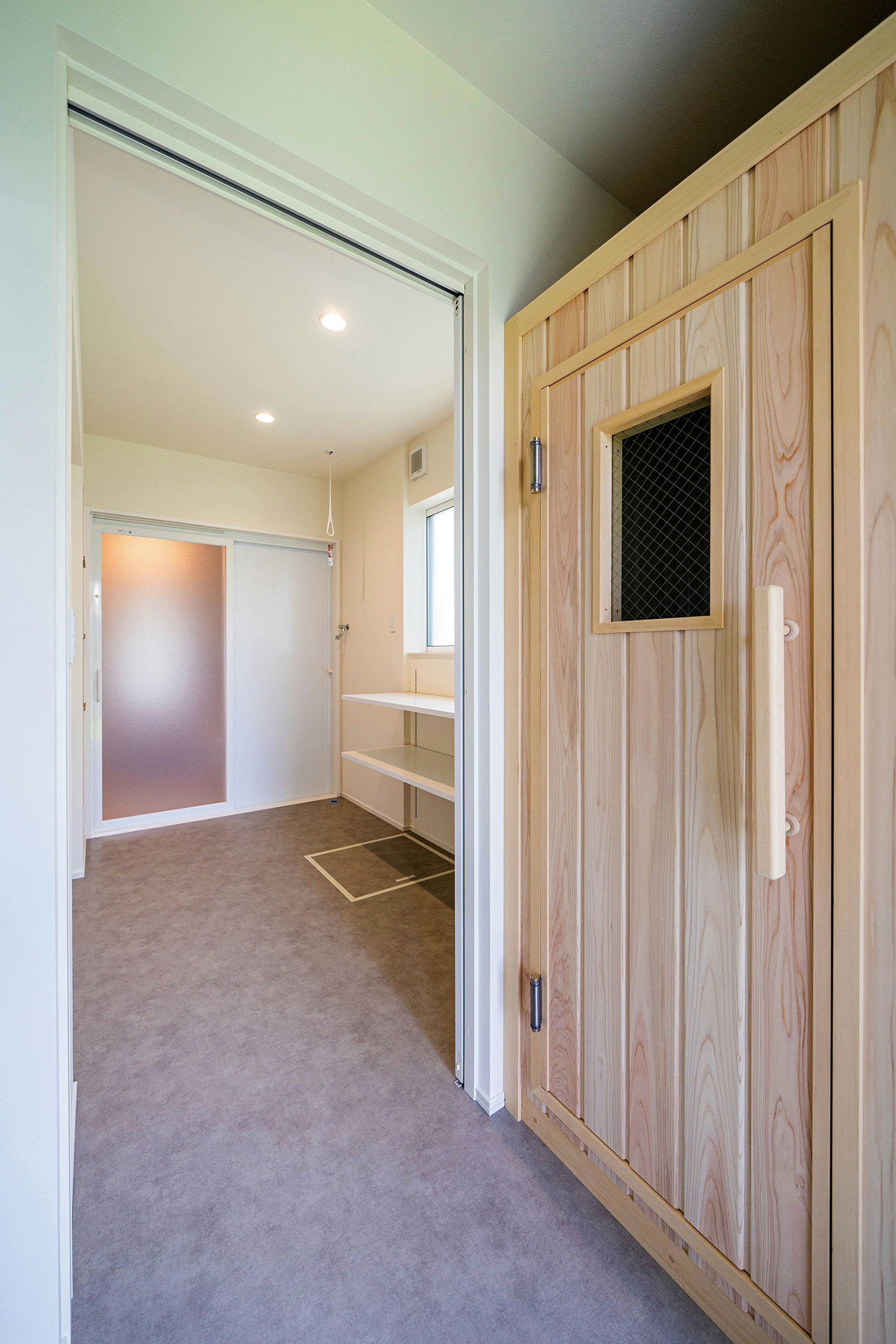 新居の注目ポイントは、サウナ設備と、サウナを全力で楽しむための動線だ。お風呂から、セルフロウリュができるサウナ、水温を下げるチラー付き水風呂、そして外気浴ができる庭を一直線にまとめ、庭は外の目を気にせず外気浴を楽しむため壁を設けて完全なプライベートスペースに。「前例のない要望だったそうなんですが、希望を叶えてもらえて大満足です」とご主人は幸せそう。