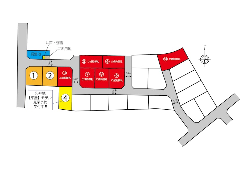 | 私道負担・道路 | 前面道路6m(アスファルト舗装)・分譲地内 融雪装置完備 |